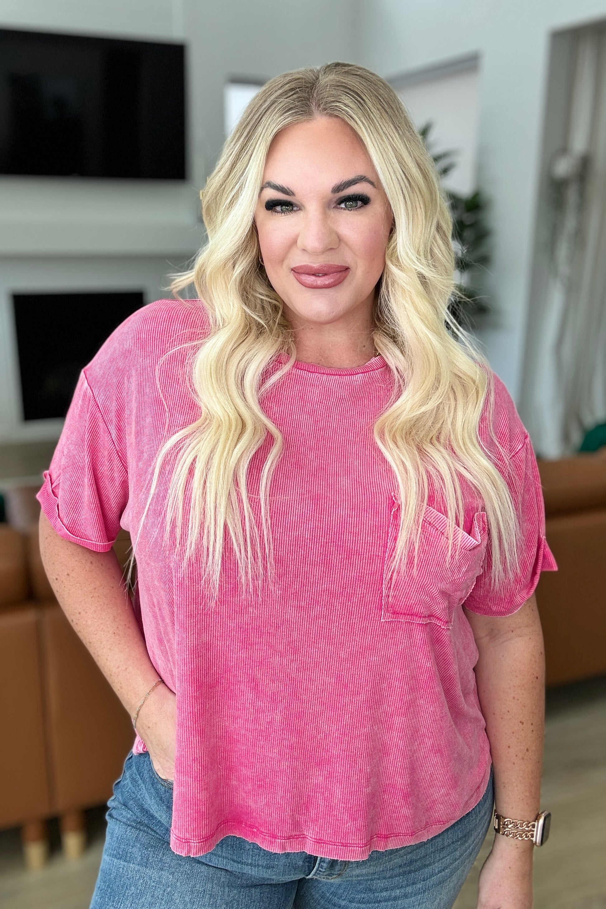 Mineral Wash Ribbed Round Neck Top in Hot Pink